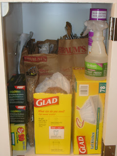 I’m going to try to remember to take before and after photos. Of course, I didn’t think of that until I had already pulled out most of the stuff in the first cabinet I cleaned out. This is the cabinet in our kitchen where I store paper, plastic and garbage bags. The kitchen trash can is to the right of this so it’s a handy place to also keep disinfectant spray. I started using re-usable bags at the grocery store a few years ago and now I virtually never forget to take them in with me. On the other hand, David and Chris occasionally will pick up something at a store so we still get a few bags now and then. We no longer have an indoor cat so I don’t need them for the litterbox but Chris has one at his house so he does come get a few bags every now and then. I started with this project because it was an easy one and it’s nice to get off to a good start.